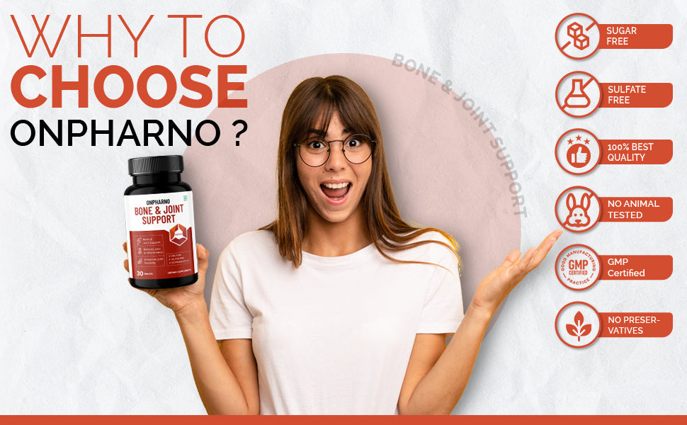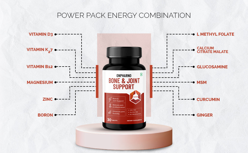 Discover the benefits of our Bone and Joint Support supplements, enriched with , calcium, glucosamine, MSM, Vitamin D3 etc to strengthen bones, relieve joint pain, and enhance mobility. Perfect for those seeking improved bone health, cartilage repair, and pain relief.